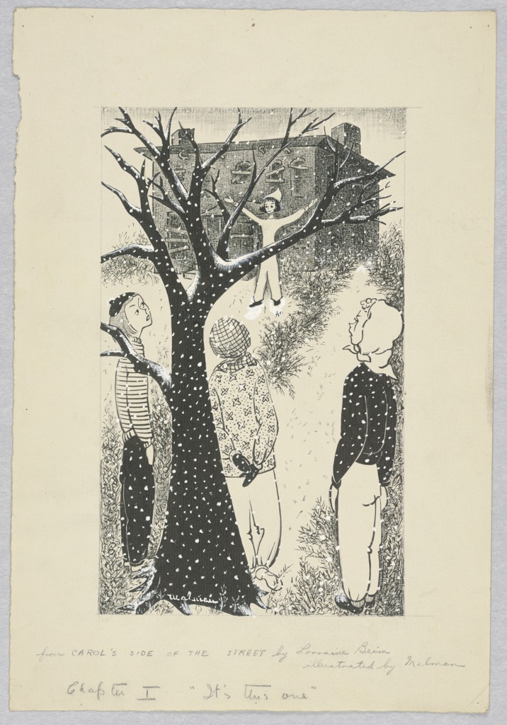 Inscribed in graphite, lower margin: "from CAROL'S SIDE OF THE STREET by Lorraine Beim, illustrated by Malman, Chapter I, 'It's this one.'"