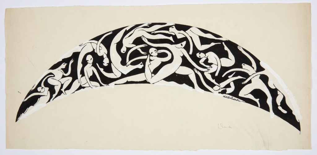 Drawing, Dancing Nude Females (Lunette); Christina Malman (American, b. England, 1911–1959); USA; pen and ink, brush and ink, white gouache, blue color pencil on cream paper; 24.3 × 51.1 cm (9 9/16 × 20 1/8 in.); 1960-214-96
