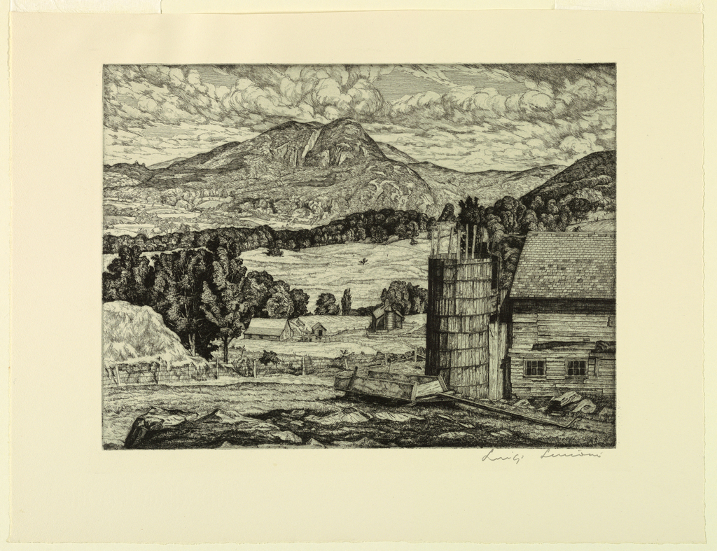 This is a Print. It was created by Luigi Lucioni and published by Associated American Artists. It is dated 1937 and we acquired it in 1960. Its medium is etching in dark green ink on paper. It is a part of the Drawings, Prints, and Graphic Design department.