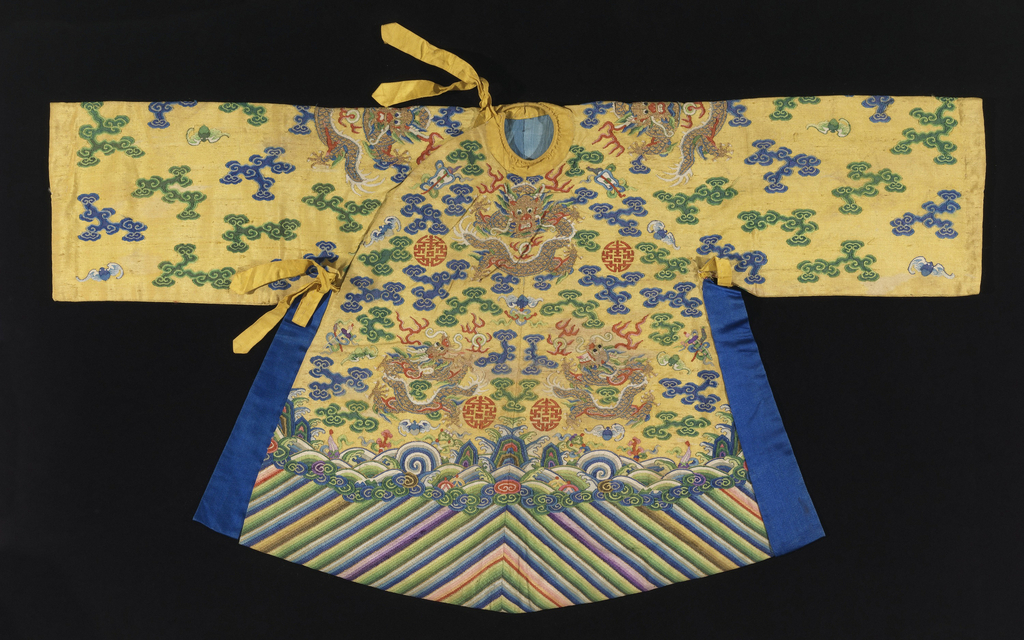 This small, 18th-century Chinese robe is made of silk, enhanced by metallic threads, and boasts a pattern comprised primarily of dragons punctuated by blue and green clouds, flaming pearls, bats and other auspicious symbols. The five-clawed dragon and bright yellow coloring are both symbols of the Emperor of China, and the robe itself was more than likely an imperial donation used to clothe a statue of an emperor in a Taoist temple.