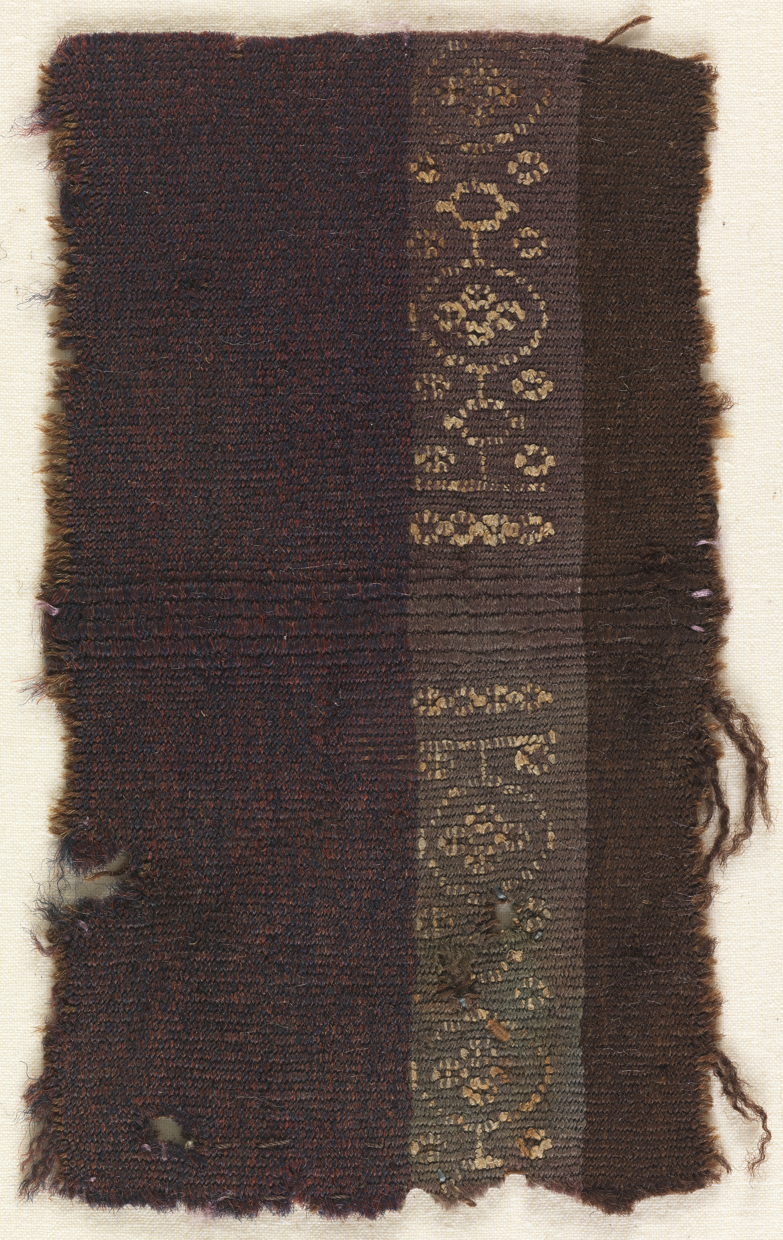 This is a Fragment. It is dated 4th–6th century and we acquired it in 1960. Its medium is linen, wool and its technique is plain weave with discontinuous wefts (tapestry). It is a part of the Textiles department.
