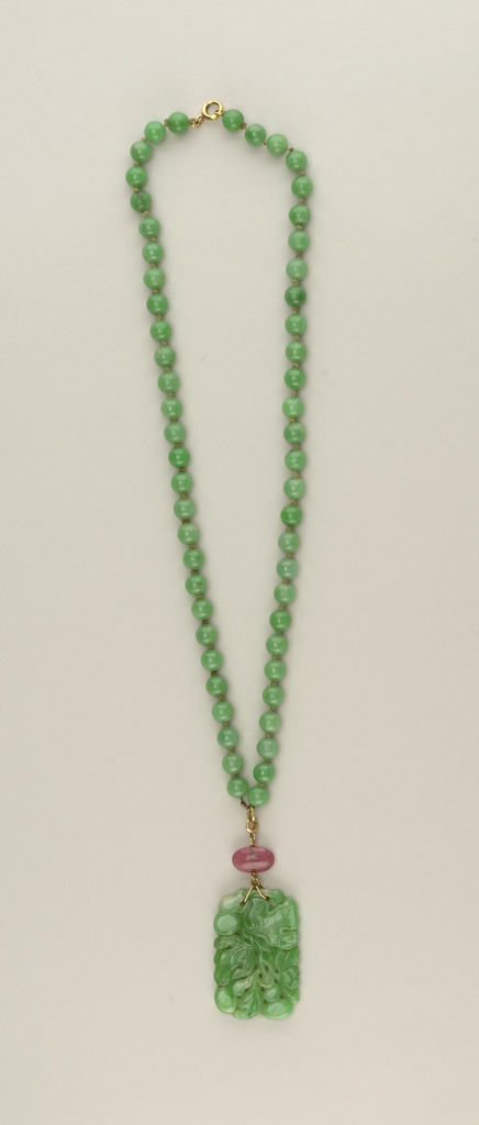 This is a Necklace and pendant. It is dated ca. 1900 and we acquired it in 1960. Its medium is jade,gold, thread. It is a part of the Product Design and Decorative Arts department.
