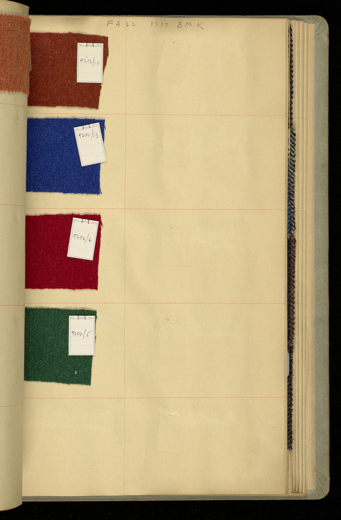 This is a Sample book. It was manufactured by Richard Fensterer and Company, H.G. Moore & Company, Commodore Woolen Company and Hudson River Fabrics Company. It is dated ca. 1920 and we acquired it in 1960. Its medium is clothbound covers, woven wool samples. It is a part of the Textiles department.