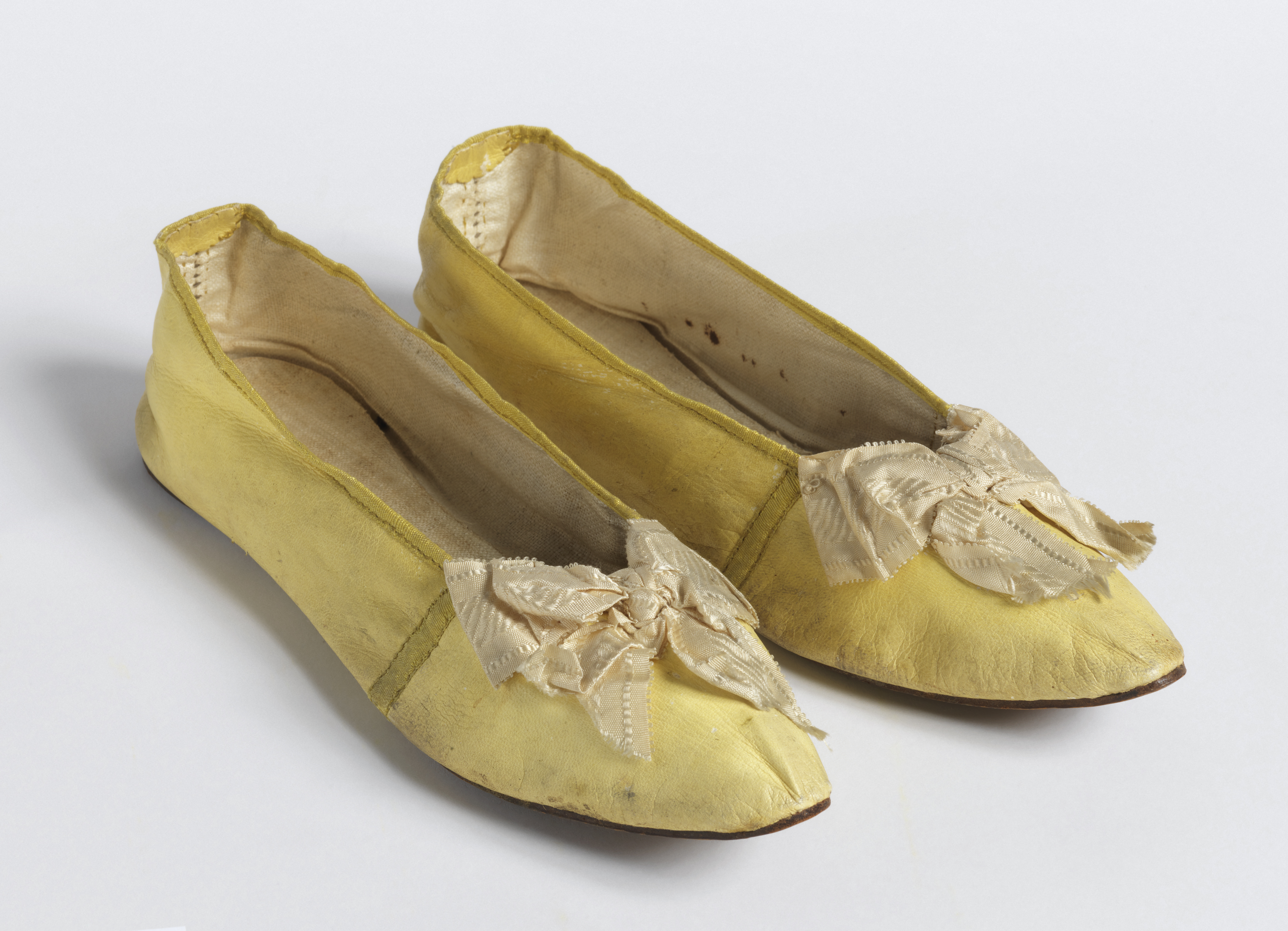 This is a Pair of slippers. It is dated 1830s and we acquired it in 1960. Its medium is label: leather sole and upper, linen lining, silk bows . It is a part of the Textiles department.
