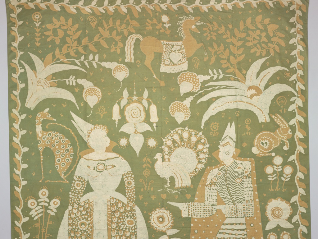 This is a Textile. It is dated 1920–30 and we acquired it in 1960. Its medium is silk and its technique is surface resist (batik). It is a part of the Textiles department.