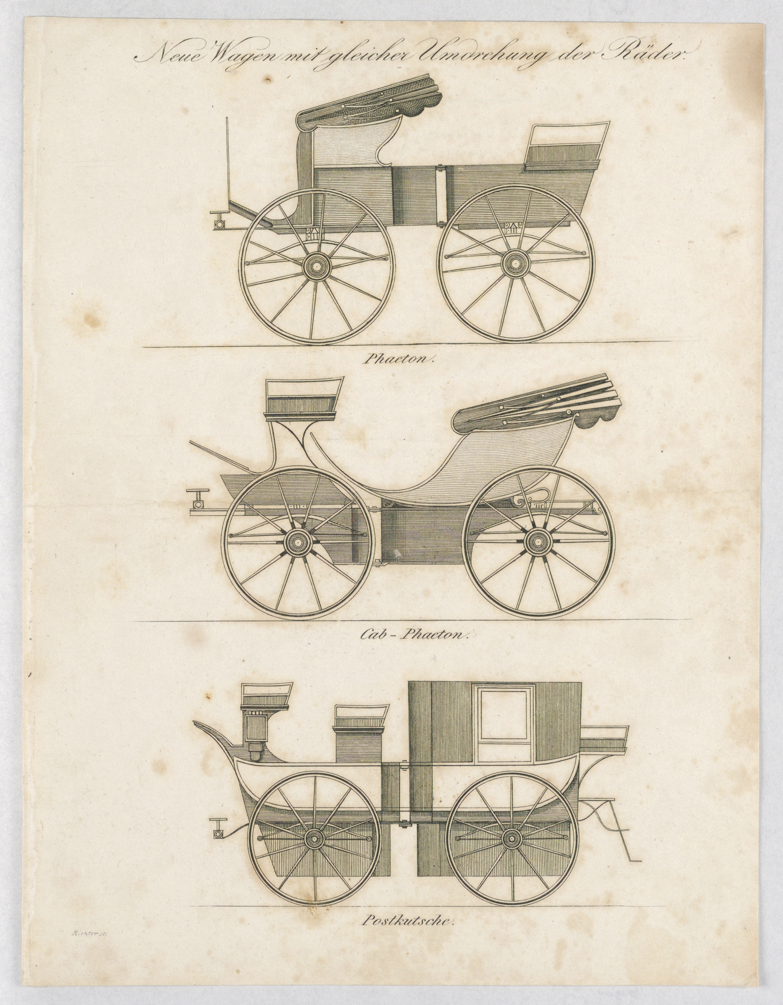 Print, Three Carriages; Print Maker: Richter (German, active 19th c.); France; engraving on paper; 27 × 20.7 cm (10 5/8 × 8 1/8 in.); Gift of Hamill and Barker; 1961-105-358