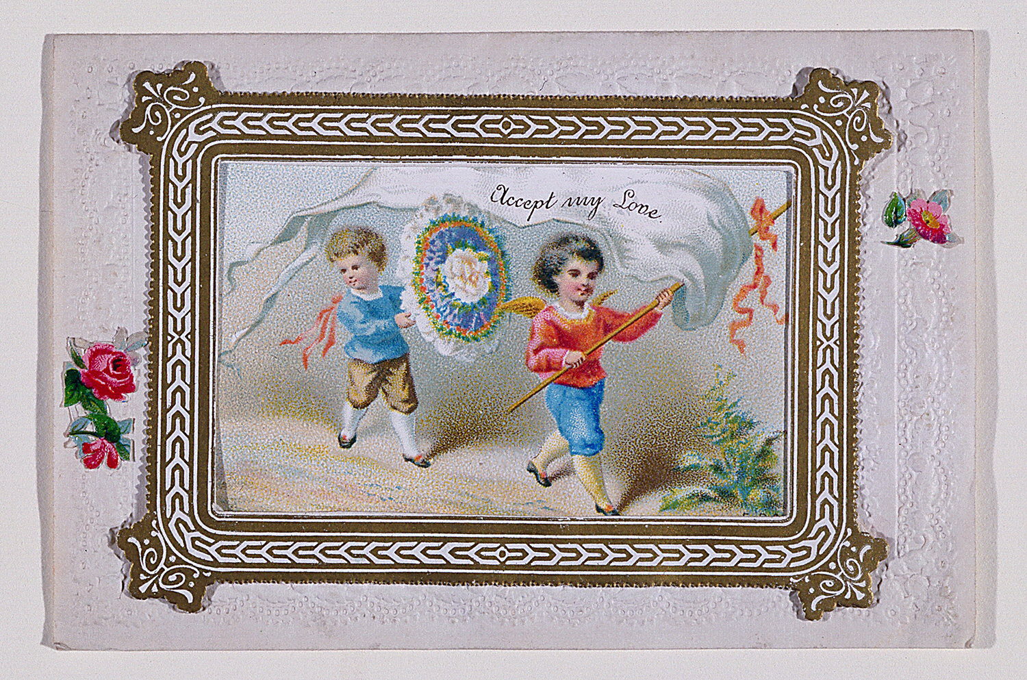 This is a Greeting card. It is dated ca. 1879 and we acquired it in 1961. Its medium is embossed paper with chromolithograph. It is a part of the Drawings, Prints, and Graphic Design department.