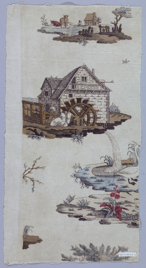 This is a Textile. It is dated 1760–1800 and we acquired it in 1961. Its medium is cotton and its technique is printed by engraved copper plate on plain weave; block printed on plain weave. It is a part of the Textiles department.
