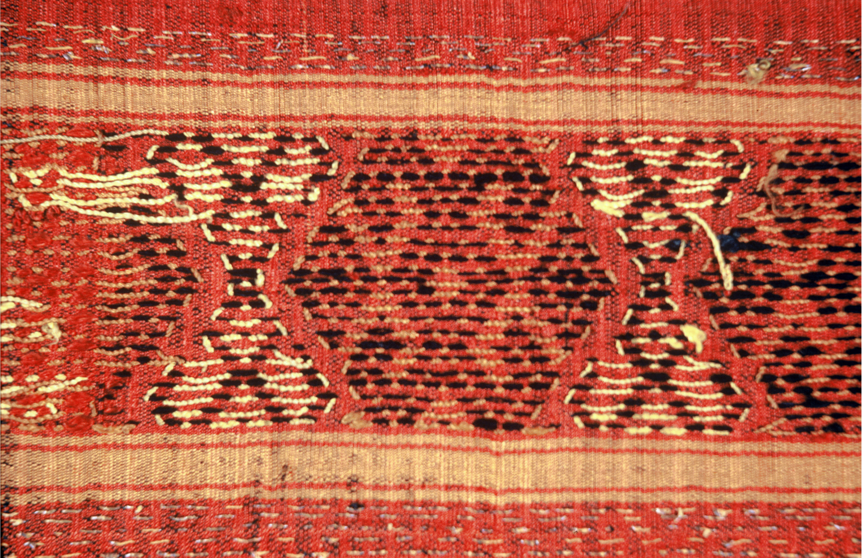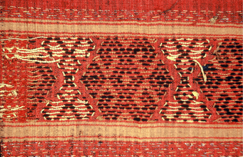 This is a Sarong. It is dated 19th century and we acquired it in 1961. Its technique is plain weave with continuous supplementary weft patterning. It is a part of the Textiles department.