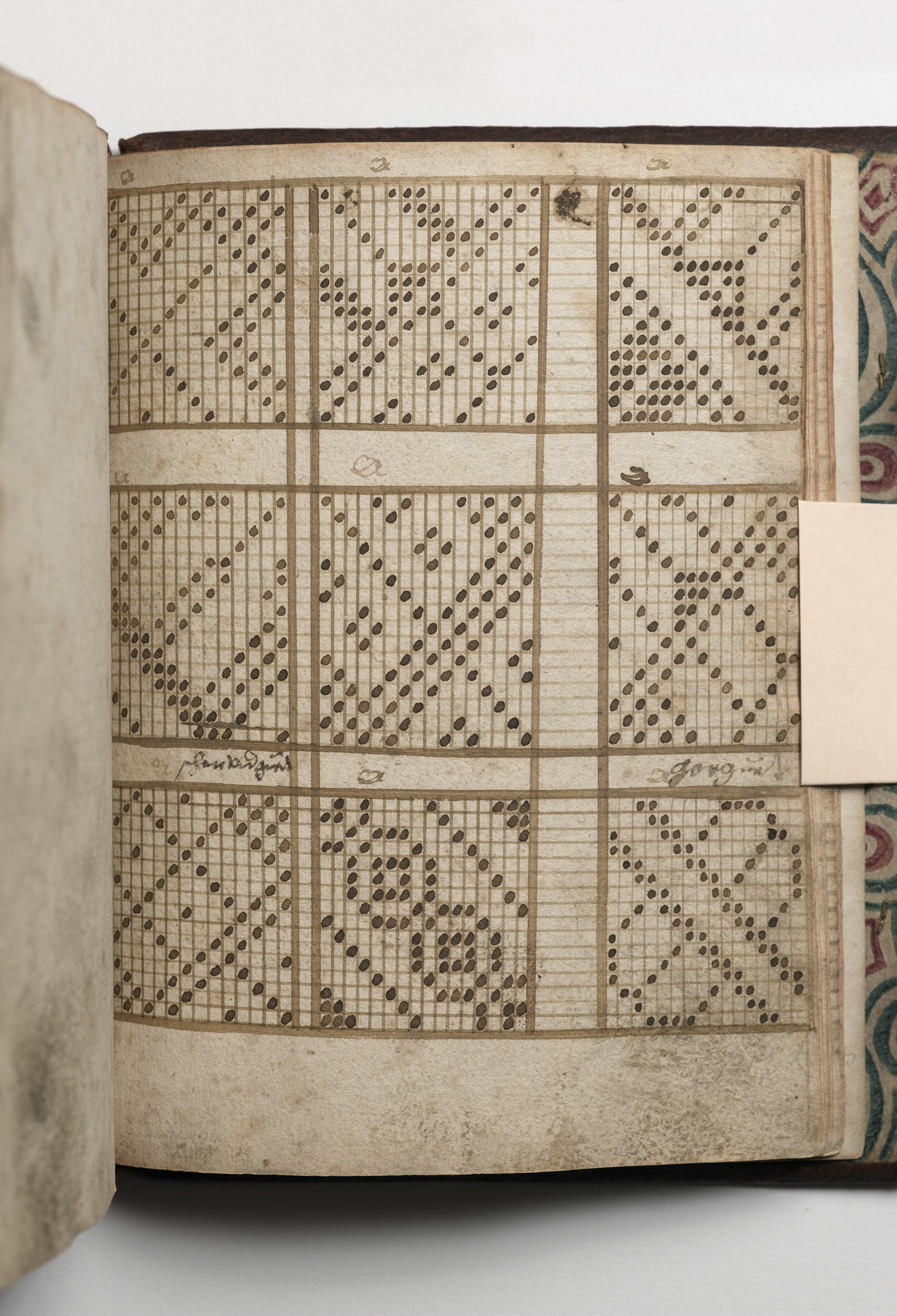 This is a Pattern book. It is dated 1760 and we acquired it in 1961. Its medium is leather, paper, metal. It is a part of the Textiles department.