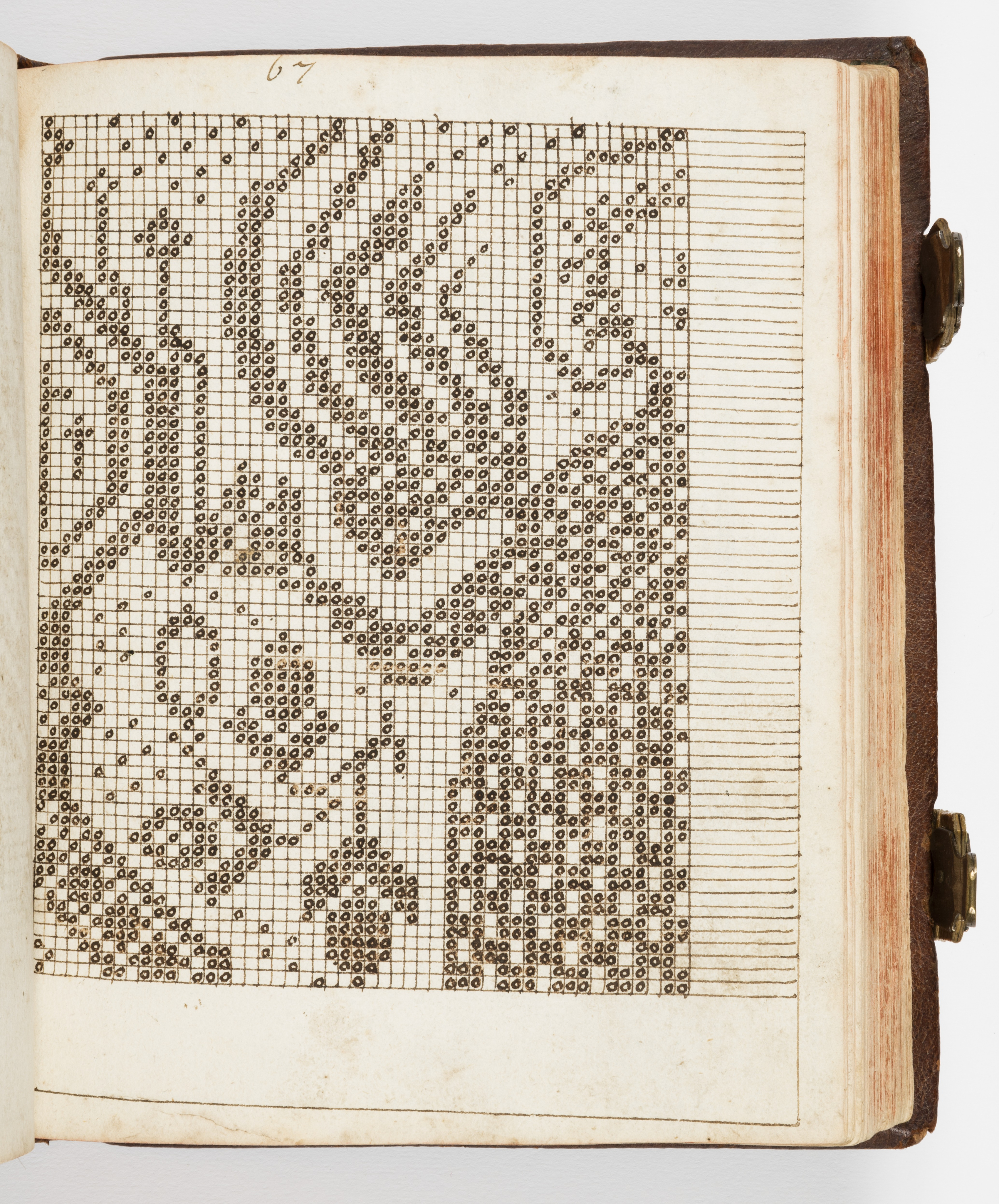 This is a Pattern book. It is dated 1760 and we acquired it in 1961. Its medium is leather, paper, metal. It is a part of the Textiles department.