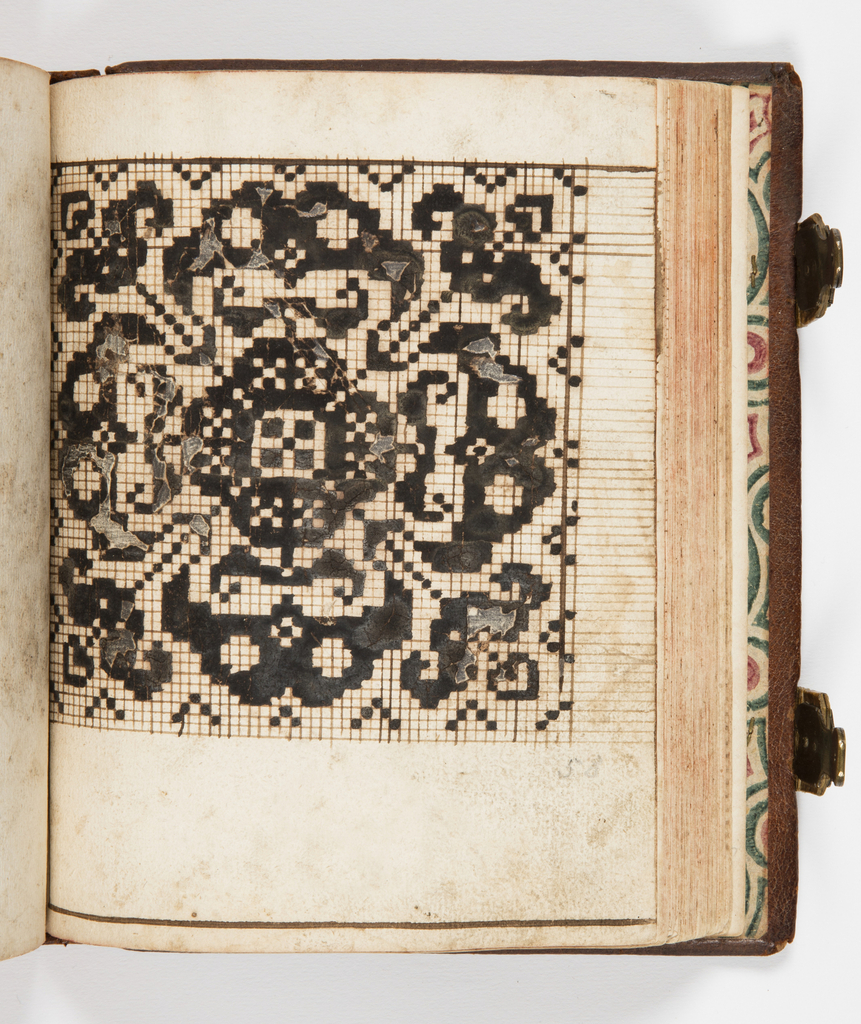 This is a Pattern book. It is dated 1760 and we acquired it in 1961. Its medium is leather, paper, metal. It is a part of the Textiles department.