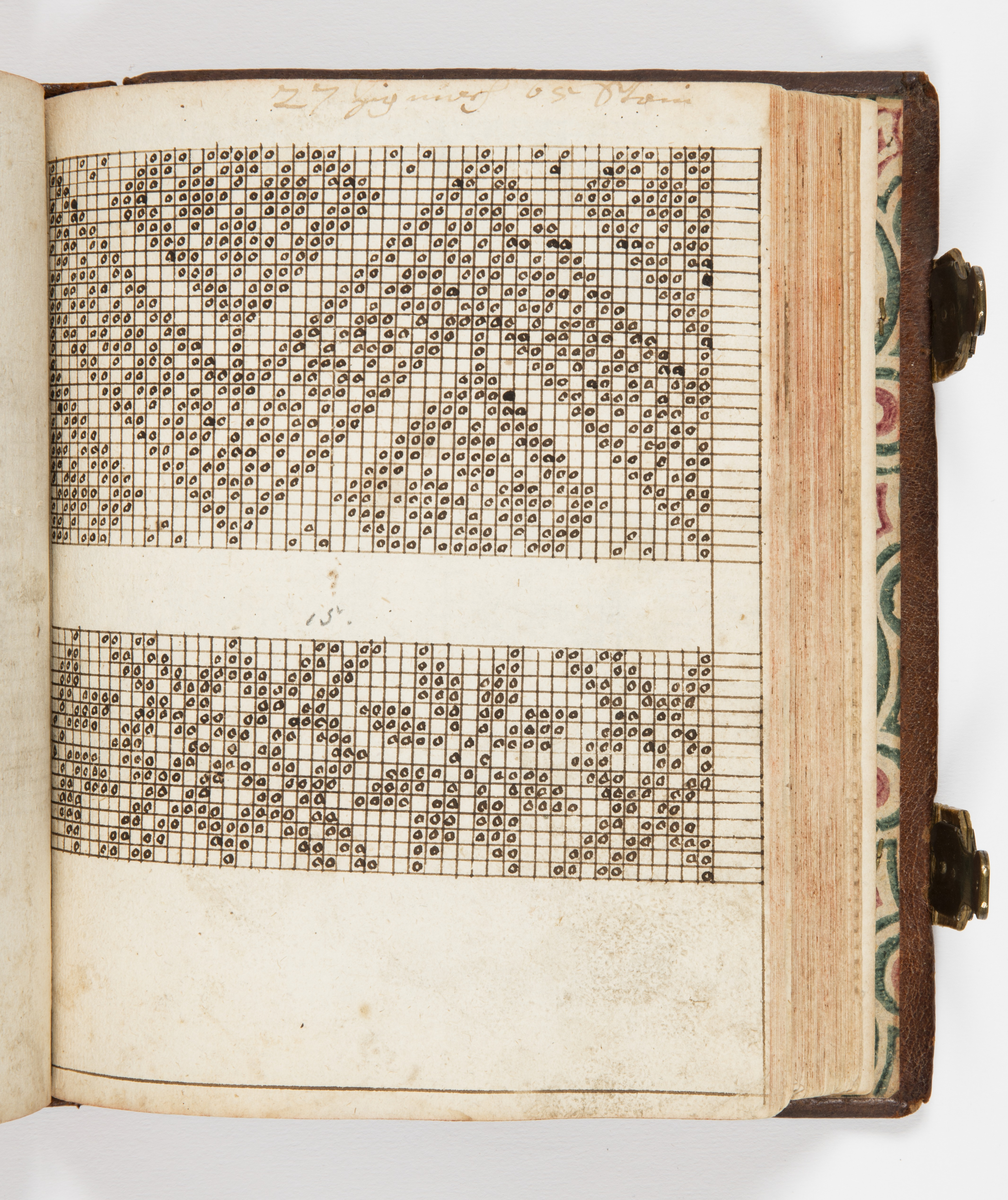 This is a Pattern book. It is dated 1760 and we acquired it in 1961. Its medium is leather, paper, metal. It is a part of the Textiles department.