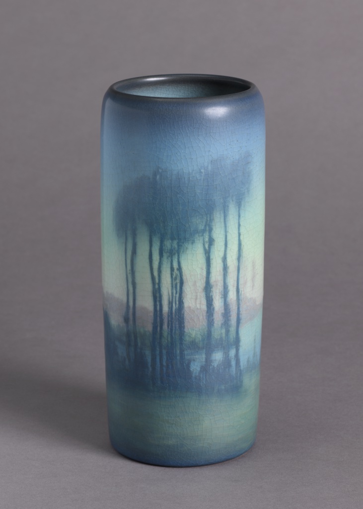 This is a Vase. It was created by Sarah Elizabeth Coyne and manufactured by Rookwood Pottery. It is dated ca. 1913 and we acquired it in 1961. Its medium is earthenware with underglaze. It is a part of the Product Design and Decorative Arts department.