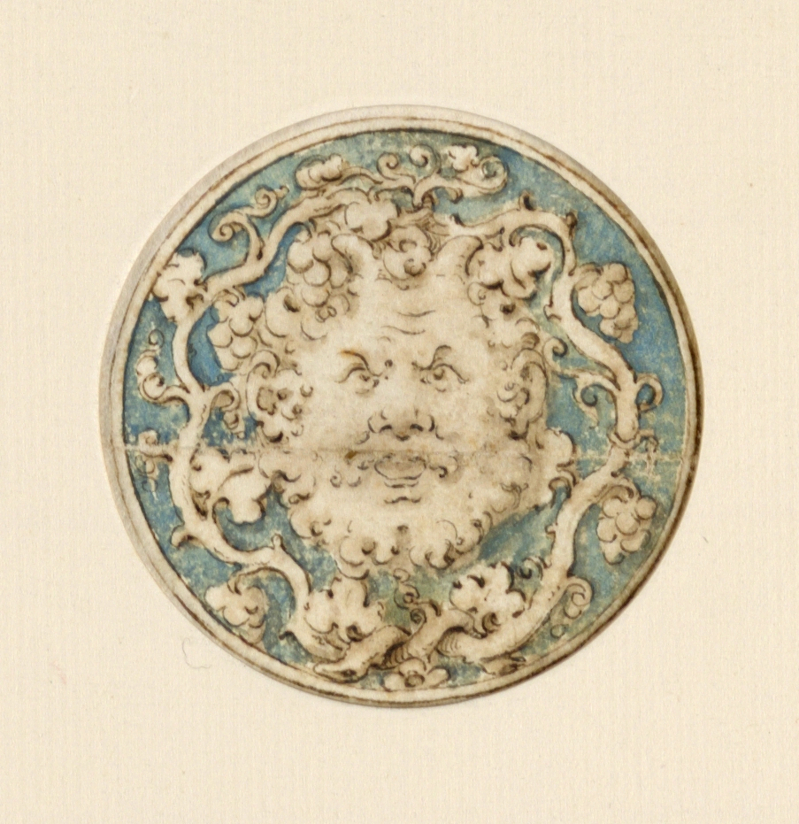 Drawing, Chased Silver Medallion; Attributed to Hans Holbein the Younger (1497/98 – 1543); Germany; pen and brown ink, brown, blue wash support: white laid paper; 6.3 x 6.3 cm (2 1/2 x 2 1/2 in.) matted w/1961-18-1,2 Mat: 35.6 x 45.7 cm (14 x 18 in.); Gift of Gramercy Park Foundation, Inc.,; 1961-18-3