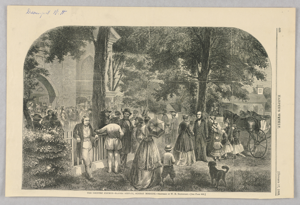 Print, The Country Church—Before Service, Sunday Morning, Illustration for Harper's Weekly (XII, October 17, 1868, p. 668); Published by Harper's Weekly; USA; wood engraving in black ink on paper; 1961-58-9