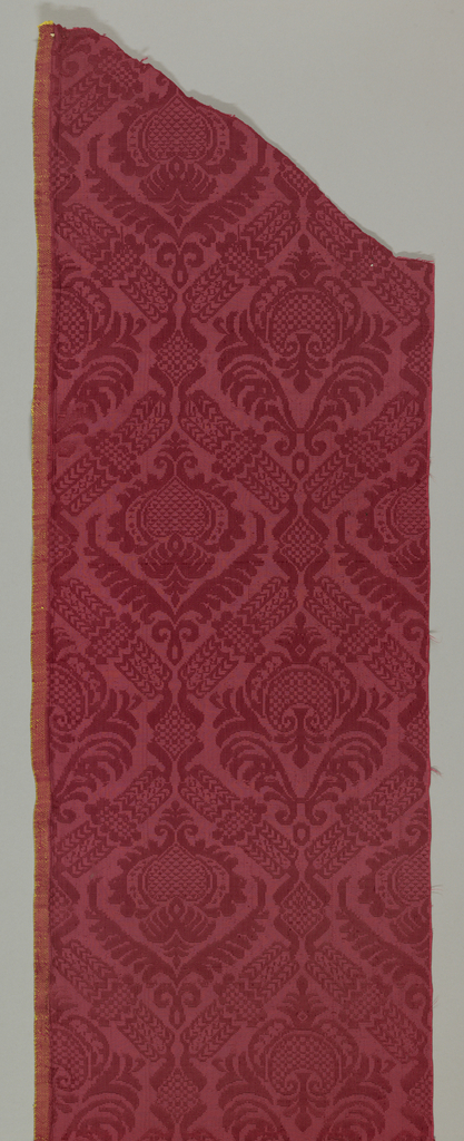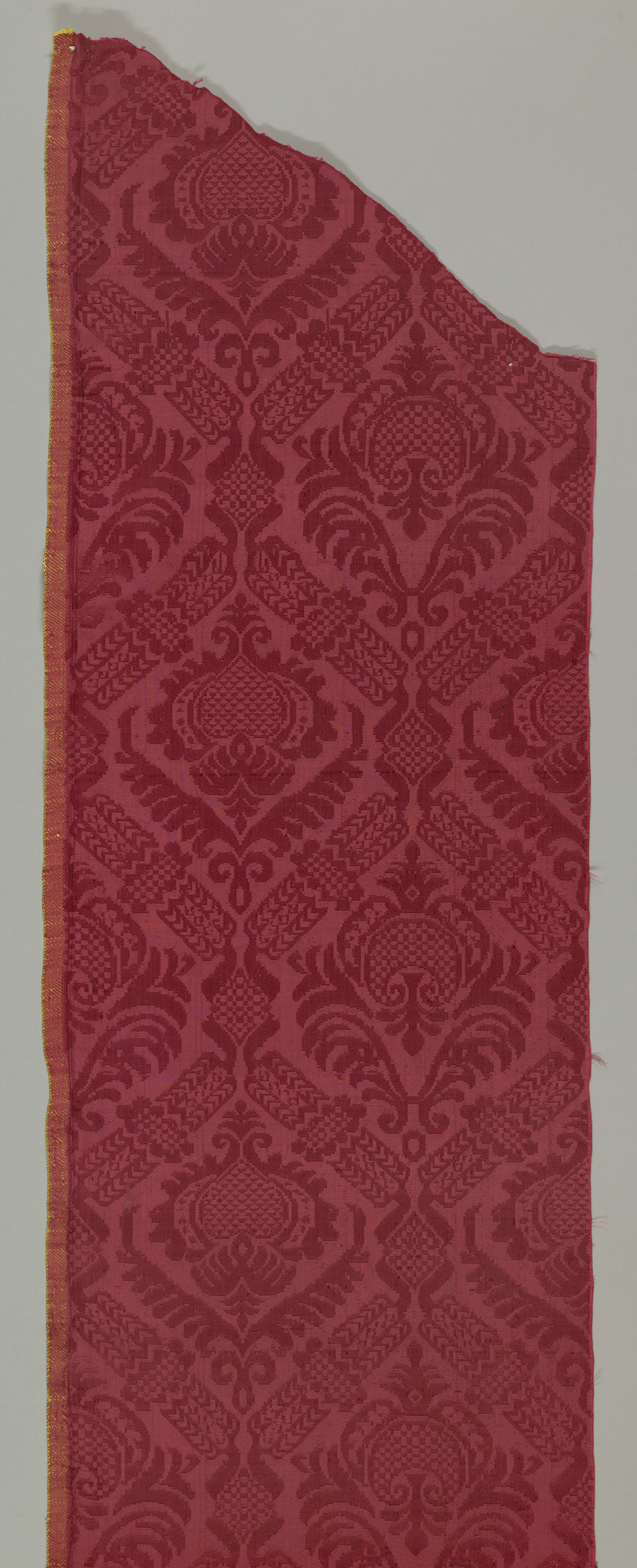 This is a Fragment. It is dated 16th–17th century and we acquired it in 1961. Its medium is silk and its technique is 5-harness satin damask. It is a part of the Textiles department.