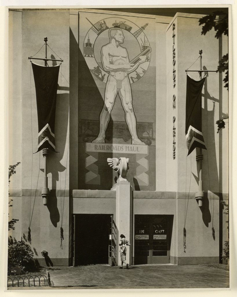 Photograph, View of the Facade of the Railroads Building, New York World's Fair, Showing "Railroads Haul" Mural
