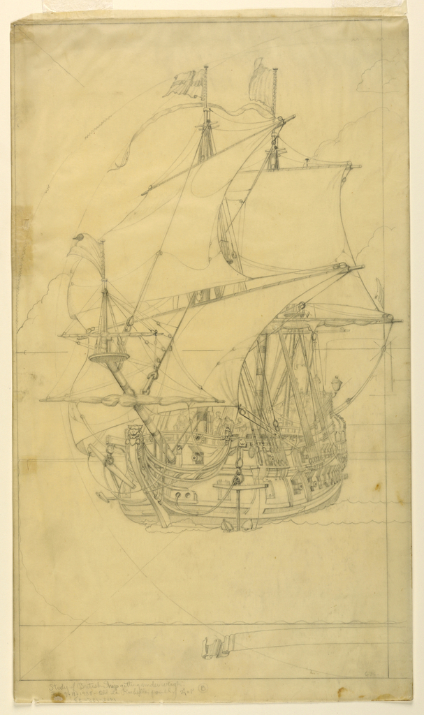 Drawing, British Ship Getting Under Weigh, Study for Mural in Schrafft's Restaurant, New Rochelle, NY; Designed by Griffiths Baily Coale (American, 1890–1950); USA; graphite on tracing paper; 47 × 27.3 cm (18 1/2 × 10 3/4 in.); Gift of Mrs. Griffith Baily Coale; 1962-135-38
