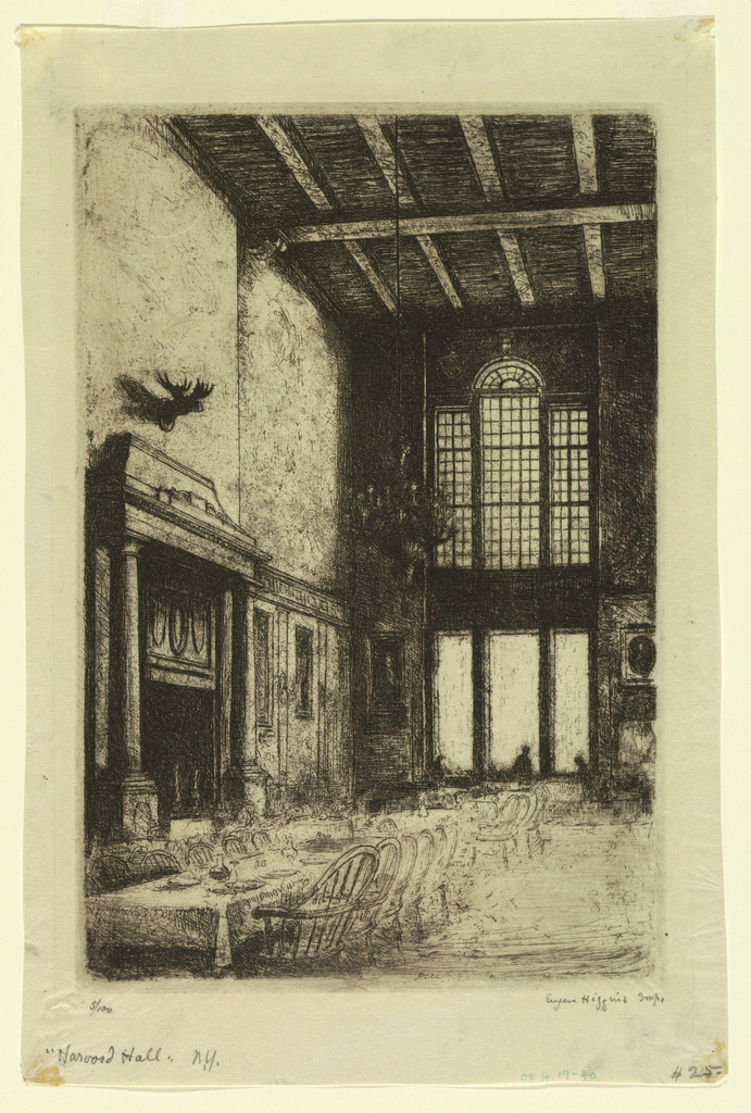 Inscribed in graphite, lower left, below plate: 5/100; in margin, lower left corner: "Harvard Hall" N.Y.; in margin, lower right corner: $25-; in green pencil in margin, lower right: OS H. 19-40