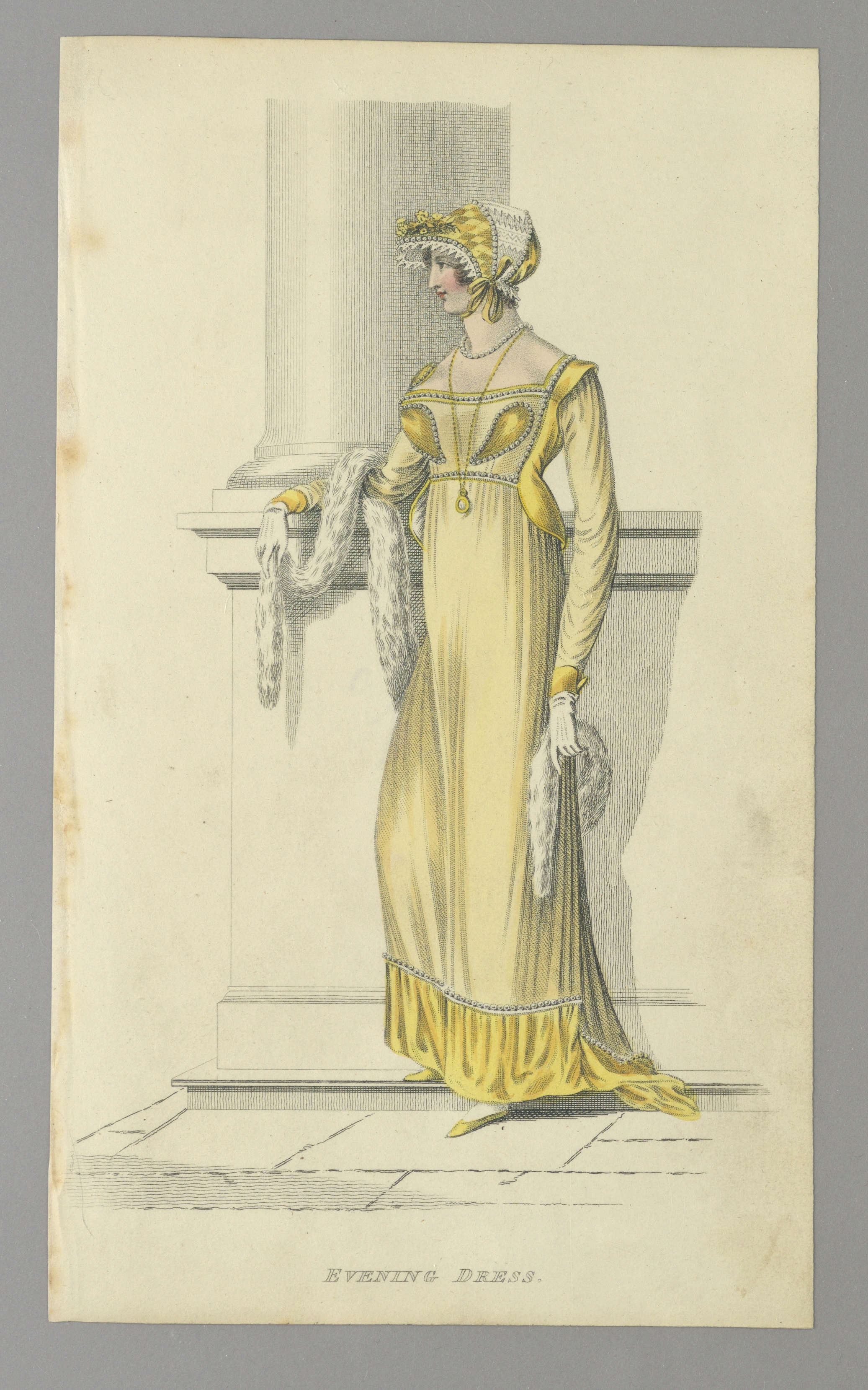 Print, Evening Dress; Published by Rudolph Ackermann (English, b. Germany, 1764–1834); engraving, brush and watercolor on paper; 23.4 × 13.9 cm (9 3/16 × 5 1/2 in.); Gift of Hamill and Barker; 1962-143-1