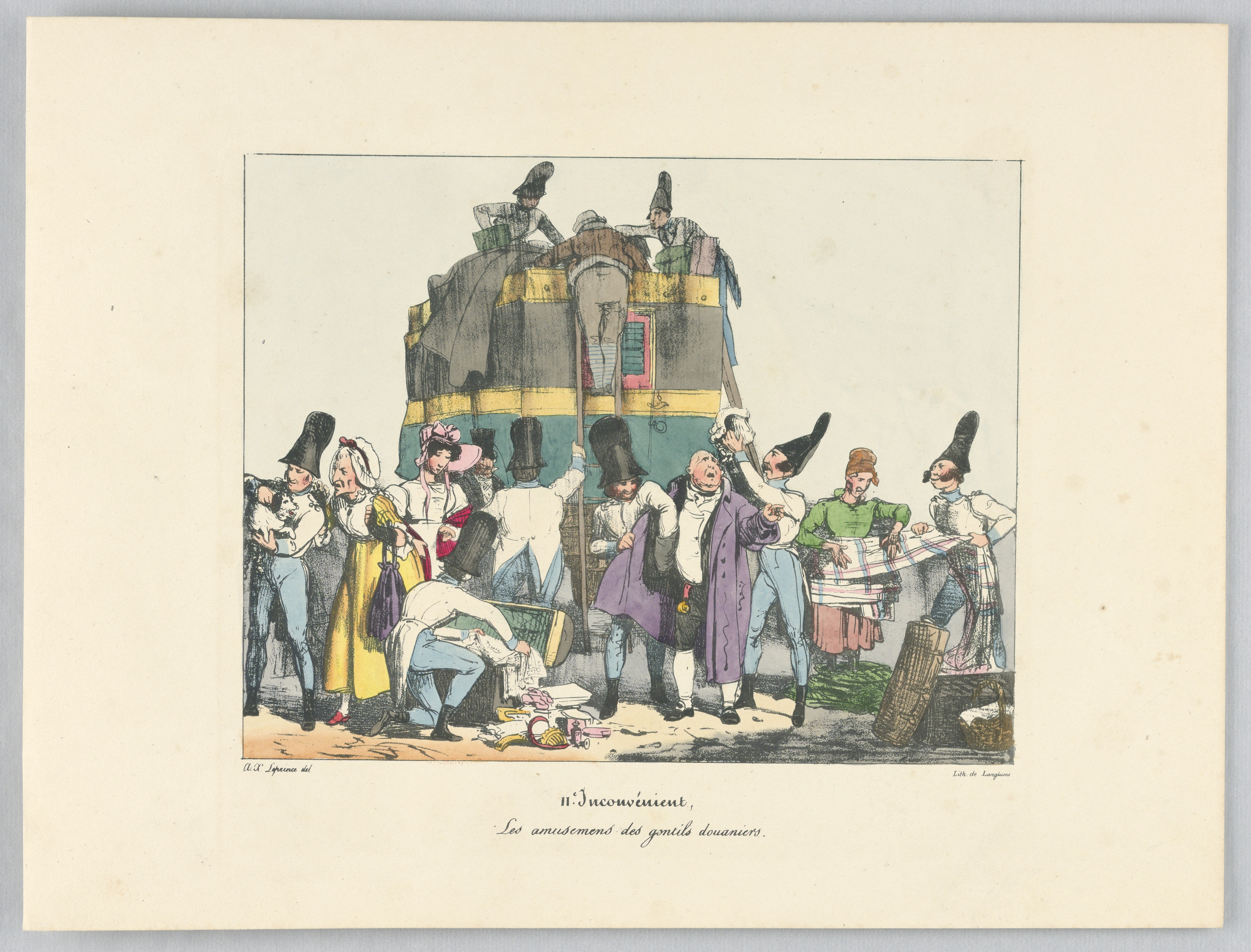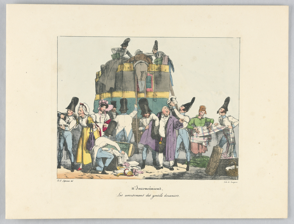 Print, Les amusemens des gentile douauiers, Plate 11 from "Inconvénient"; Auguste-Xavier Leprince (French, 1799 - 1826); Print Maker: Pierre Langlumé (French, born 1790); lithograph, brush and watercolor on paper; 25.2 × 33.4 cm (9 15/16 × 13 1/8 in.); Gift of Hamill and Barker; 1962-143-118