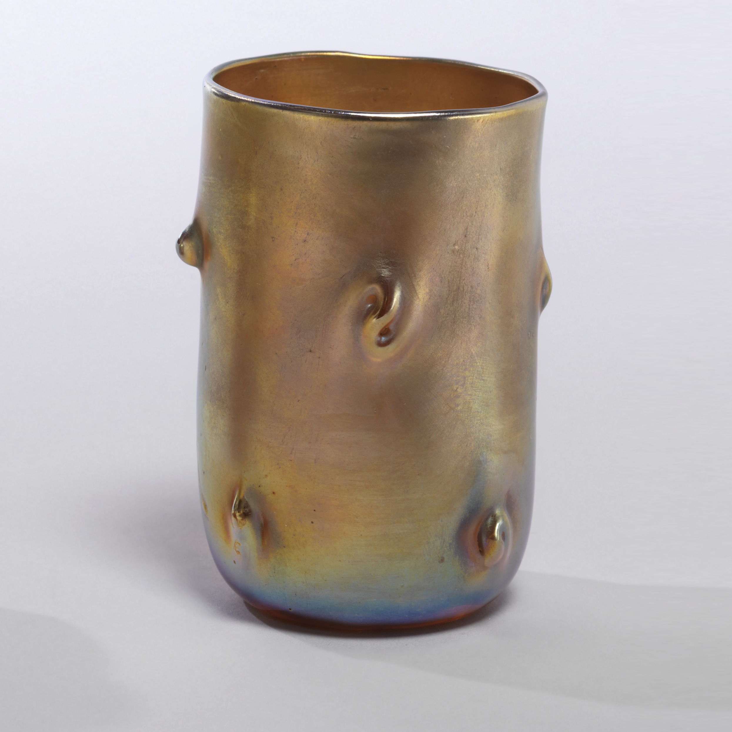 This is a beaker. It was produced by Tiffany Studios and the design director was Louis Comfort Tiffany. It is dated ca. 1910 and we acquired it in 1962. Its medium is blown favrile glass. It is a part of the Product Design and Decorative Arts department.