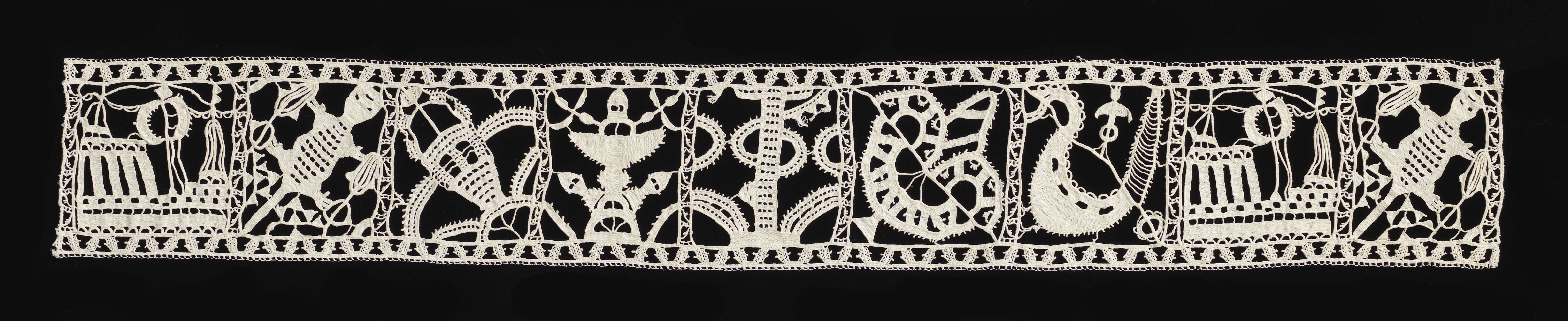 This is a Band. It is dated ca. 1600 and we acquired it in 1962. Its medium is linen and its technique is grid of laid cord with needle lace, reticella style. It is a part of the Textiles department.