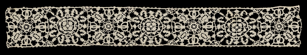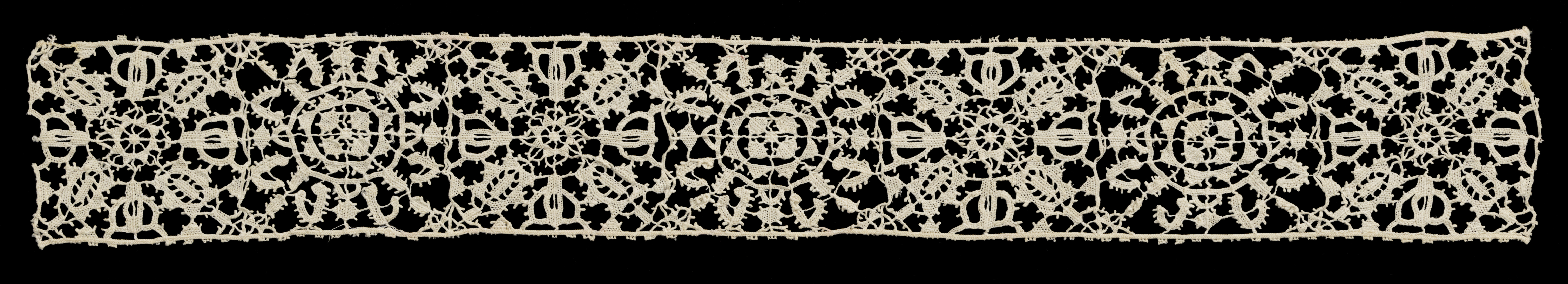 This is a Border. It is dated 17th century and we acquired it in 1962. Its medium is linen and its technique is grid of laid cord with needle lace, reticella style. It is a part of the Textiles department.
