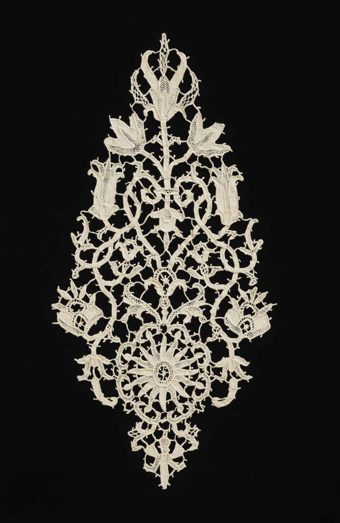 This is a Ornament. It is dated early 17th century and we acquired it in 1962. Its medium is linen and its technique is early 17th c. needle lace and style. It is a part of the Textiles department.