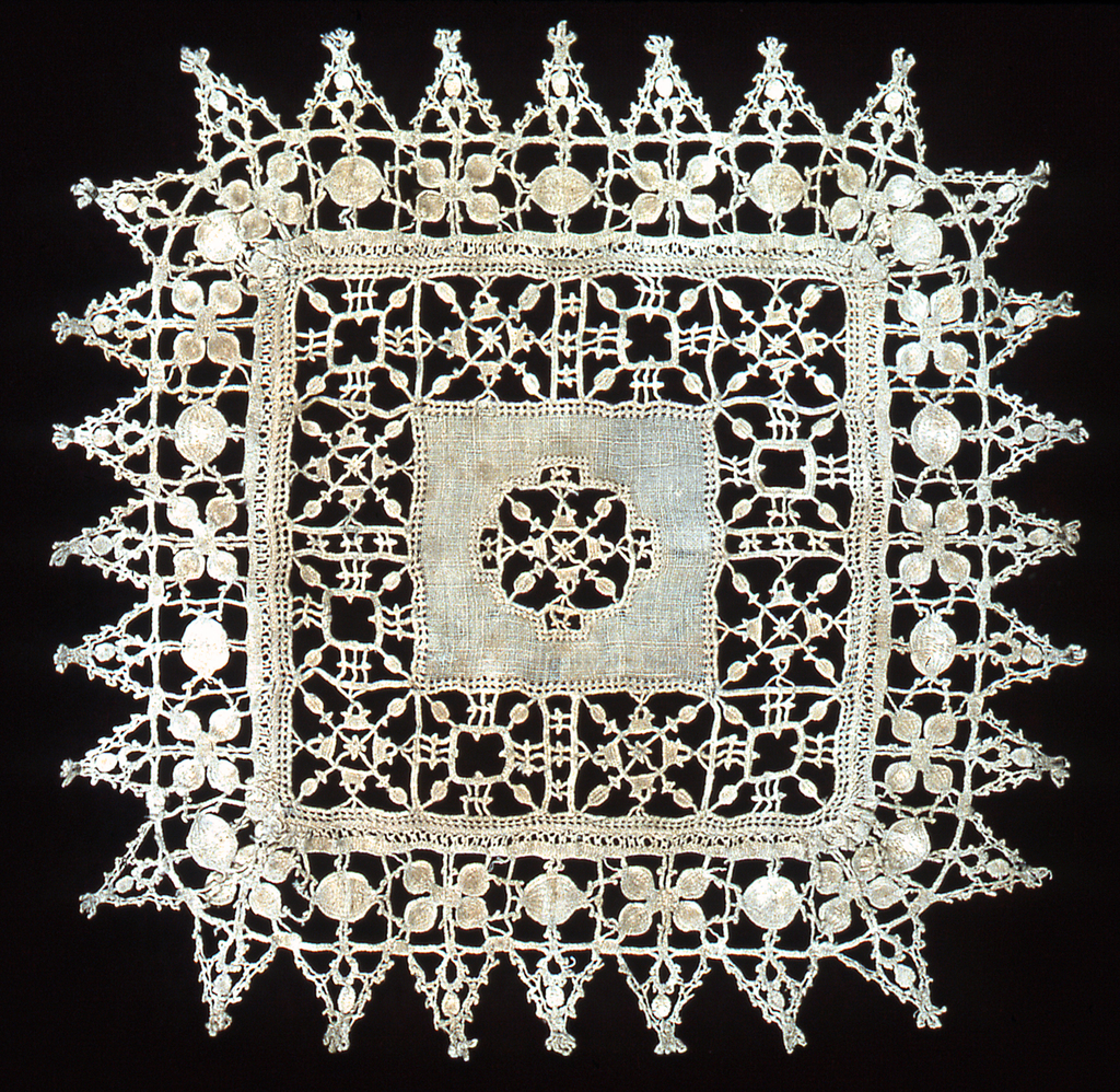 This is a Chalice cover. It is dated 17th century and we acquired it in 1962. Its medium is linen and its technique is grid of withdrawn element with needle lace, reticella style. It is a part of the Textiles department.