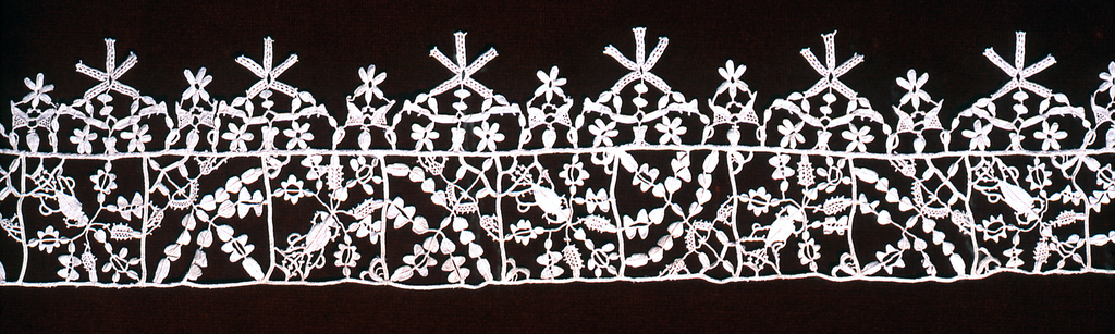 This is a Band. It is dated early 17th century and we acquired it in 1962. Its medium is linen and its technique is grid of laid cords with needle lace (reticella style), edge of punto in aria. It is a part of the Textiles department.