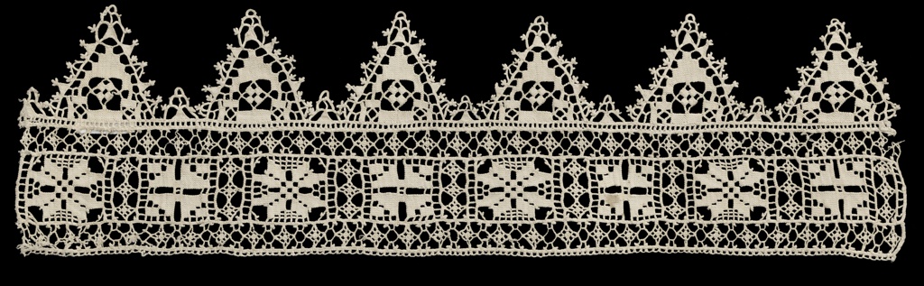 This is a Border. It is dated 17th century and we acquired it in 1962. Its medium is linen and its technique is needle knotting. It is a part of the Textiles department.