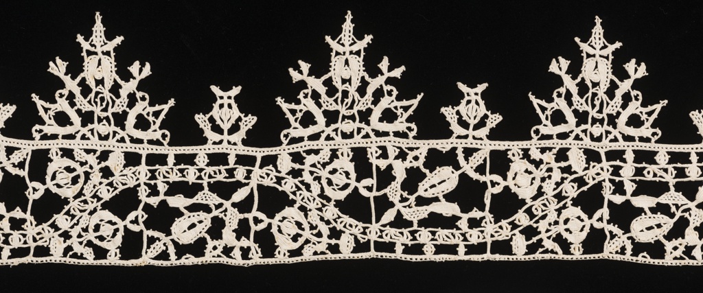 This is a Band. It is dated late 16th–early 17th century and we acquired it in 1962. Its medium is linen and its technique is needle lace (the tabs were worked on a 4-element braid. the 2 3/8 in. square grid of the band was created by two 4-element flat braids along the length connected by cords covered with figure-8 interlacing.). It is a part of the Textiles department.