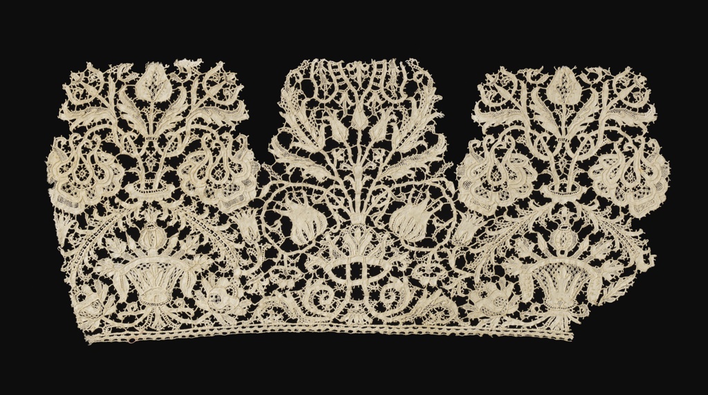 This is a Fragments. It is dated early–mid-17th century and we acquired it in 1962. Its medium is linen and its technique is early 17th c. needle lace and style. It is a part of the Textiles department.