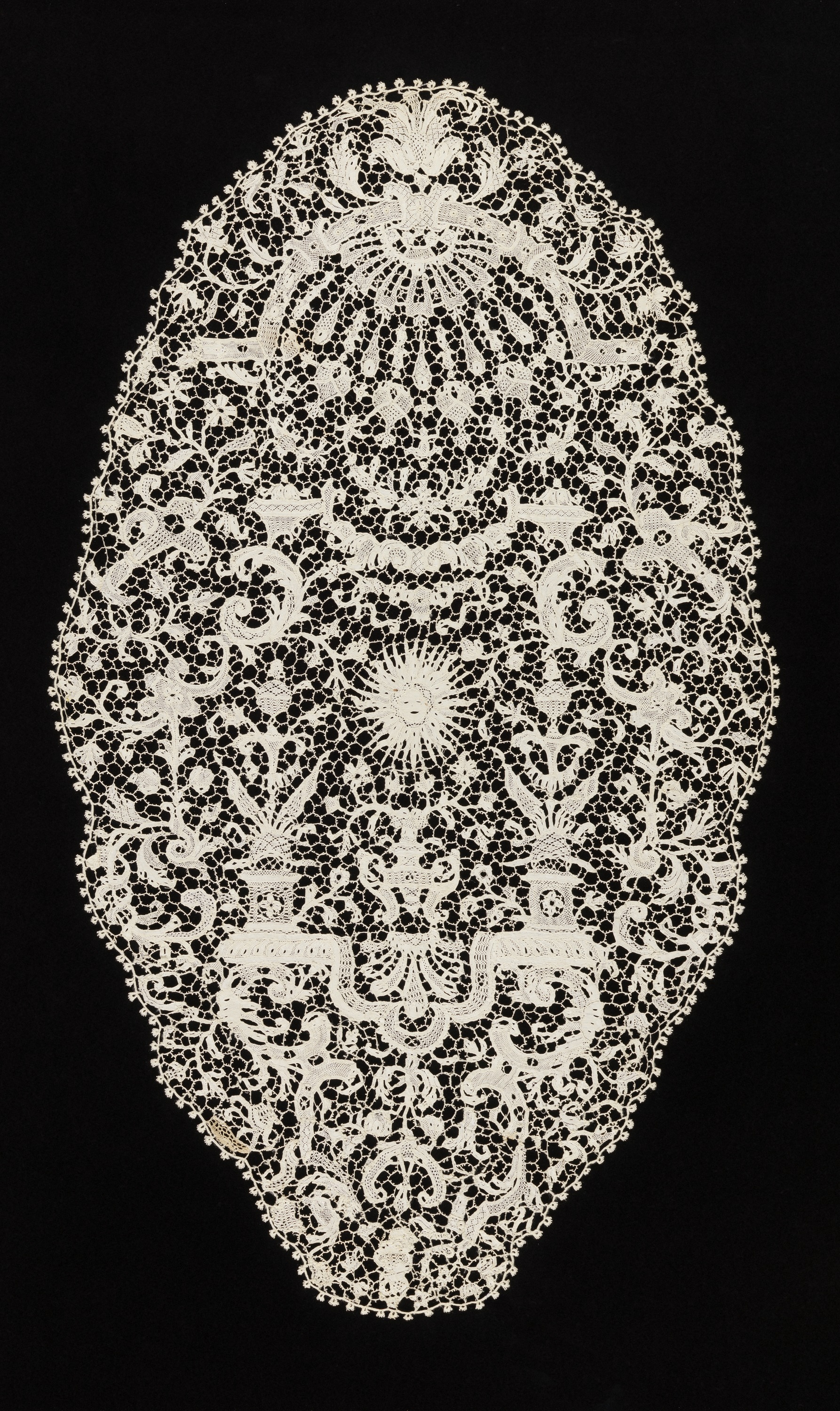 This is a Medallion. It is dated late 17th century and we acquired it in 1962. Its medium is linen and its technique is needle lace, 6 sided reworked grounds. It is a part of the Textiles department.