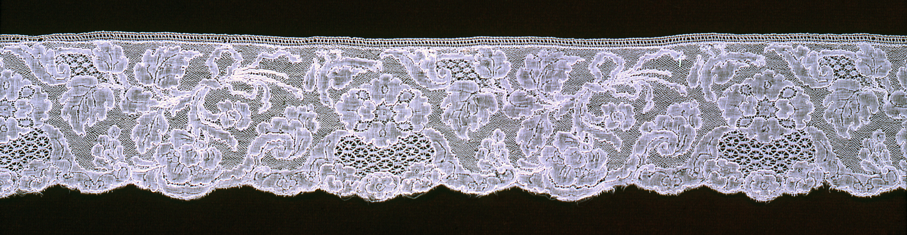 This is a Border. It is dated mid-18th century and we acquired it in 1962. Its medium is linen and its technique is bobbin lace, mechlin style. It is a part of the Textiles department.