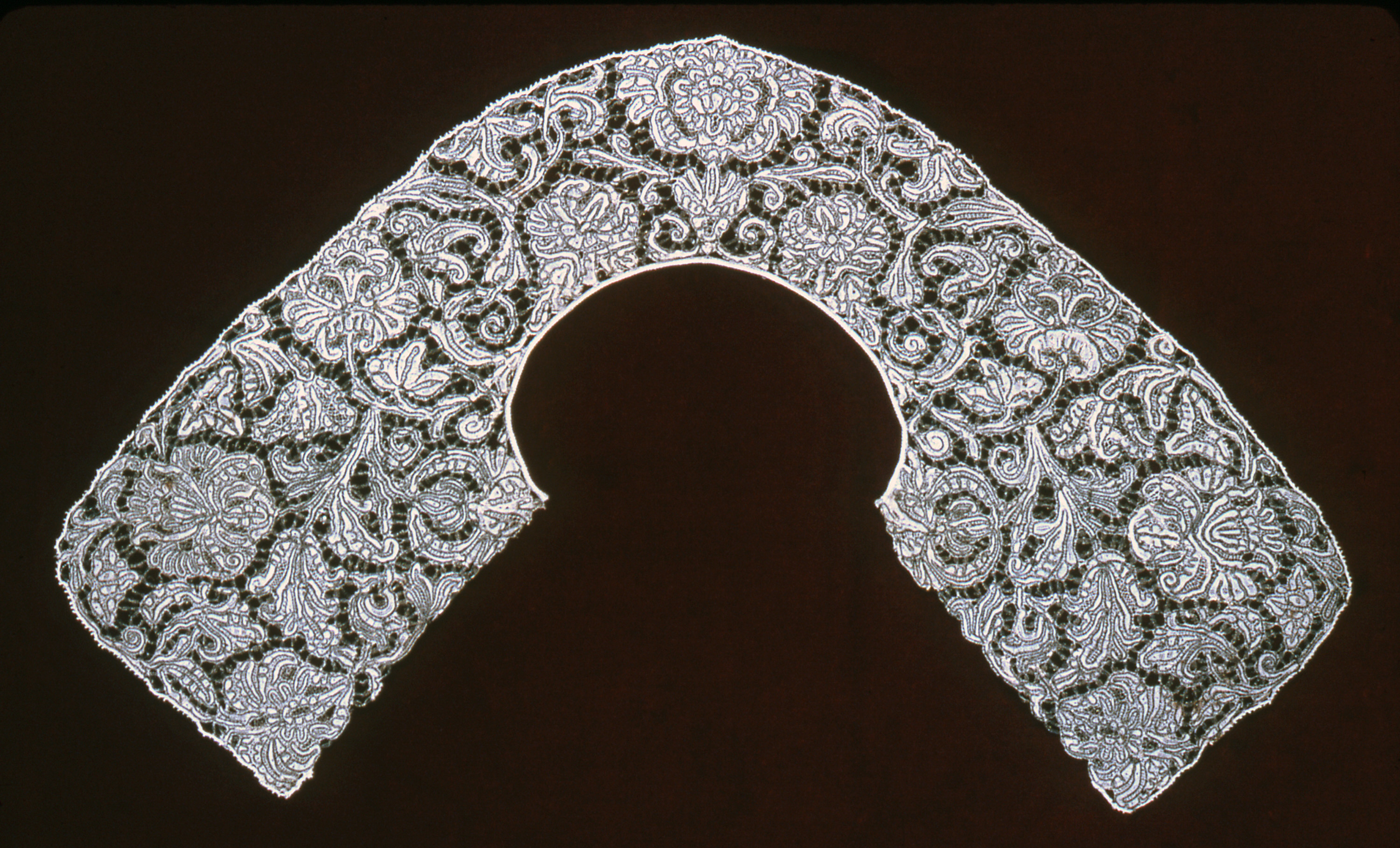 This is a Collar. It is dated 1670–85 and we acquired it in 1962. Its medium is linen, metal-wrapped silk and its technique is bobbin lace, brussels style. It is a part of the Textiles department.