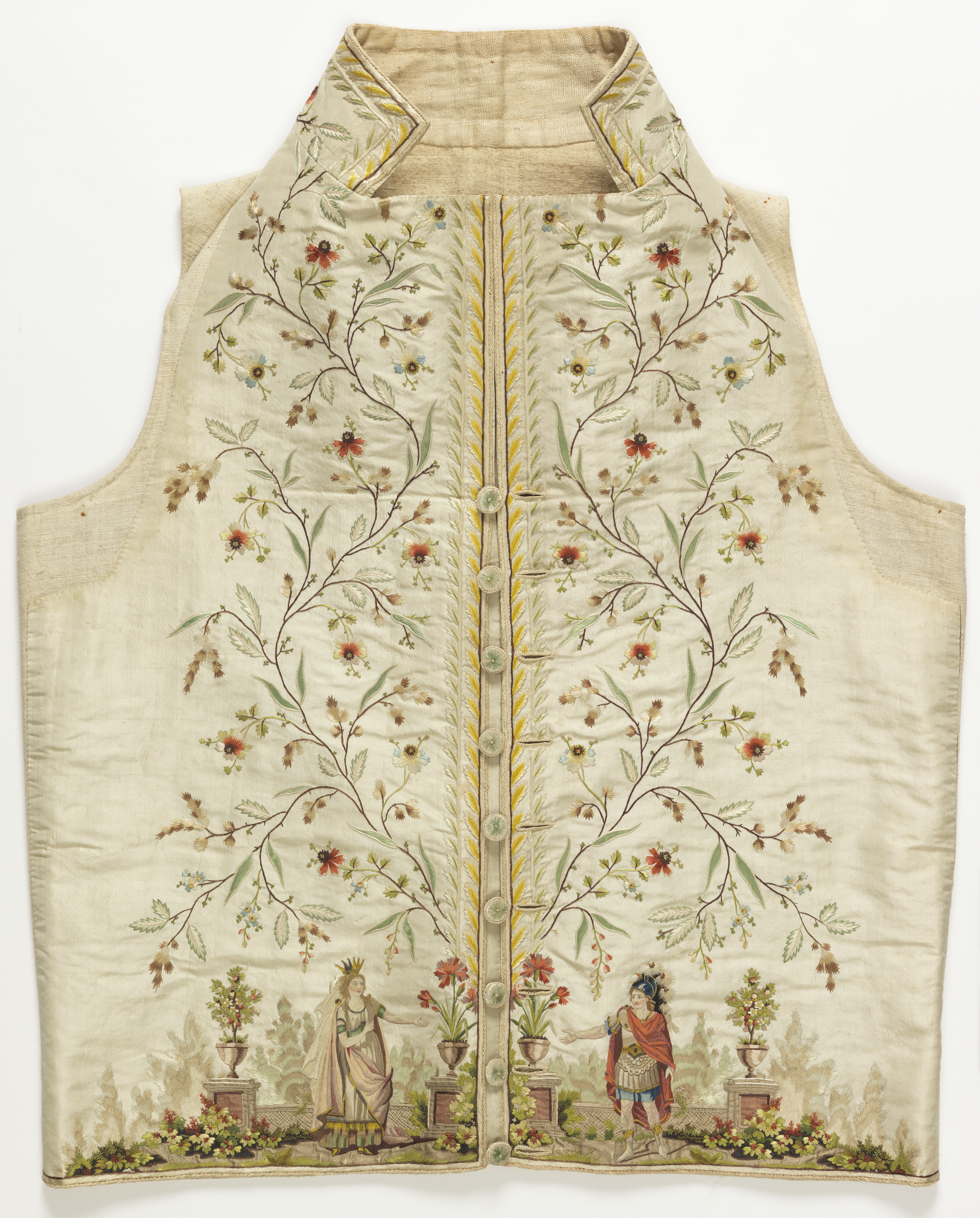 A French embroidered waistcoat dated between 1785-1795 shows Dido and Aeneas in a scene from Didon, a 1783 opera by the Italian composer Niccolò Piccini (1728-1800). The opera’s librettos were composed by Jean-François Marmontel (1723-1799), a highly-respected French historian and writer. Derived from Virgil’s Aeneid, the opera tells a fictional version of the story of Dido, Queen of Carthage, and the Trojan hero, Aeneas, who went on to found the Roman race. The opera had its public premiere in Paris in December 1783 and was an instant success, enjoying more than 200 performances.