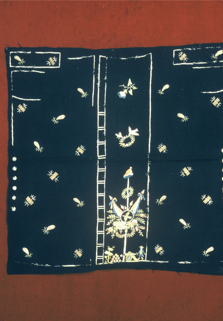 This is a Uncut waistcoat. It is dated 1790–1792 and we acquired it in 1962. Its medium is silk on wool and its technique is 2/2 twill embroidered in stem and satin stitches. It is a part of the Textiles department.