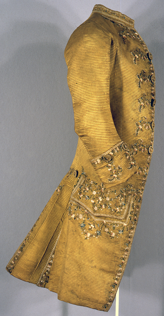 This is a Coat. It is dated mid- 18th century and we acquired it in 1962. Its medium is silk and its technique is embroidered. It is a part of the Textiles department.