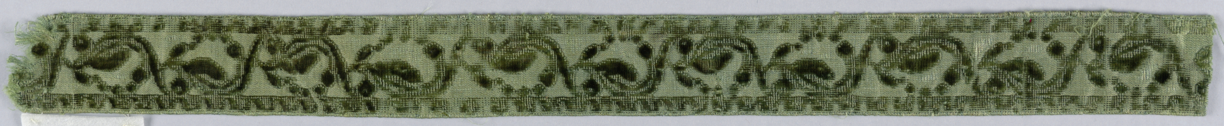 This is a Fragments. It is dated late 18th–early 19th century and we acquired it in 1962. Its medium is silk and its technique is cut and uncut supplementary warp pile (velvet) in a woven foundation. It is a part of the Textiles department.