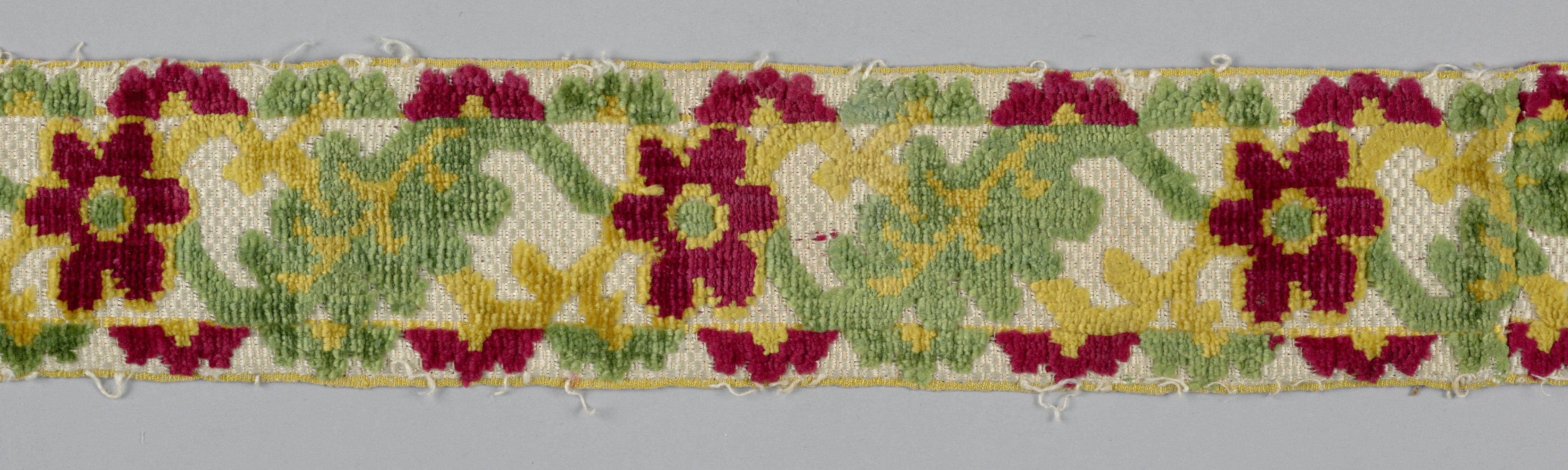 This is a Trimmings. It is dated late 18th–early 19th century and we acquired it in 1962. Its medium is silk and its technique is velvet. It is a part of the Textiles department.