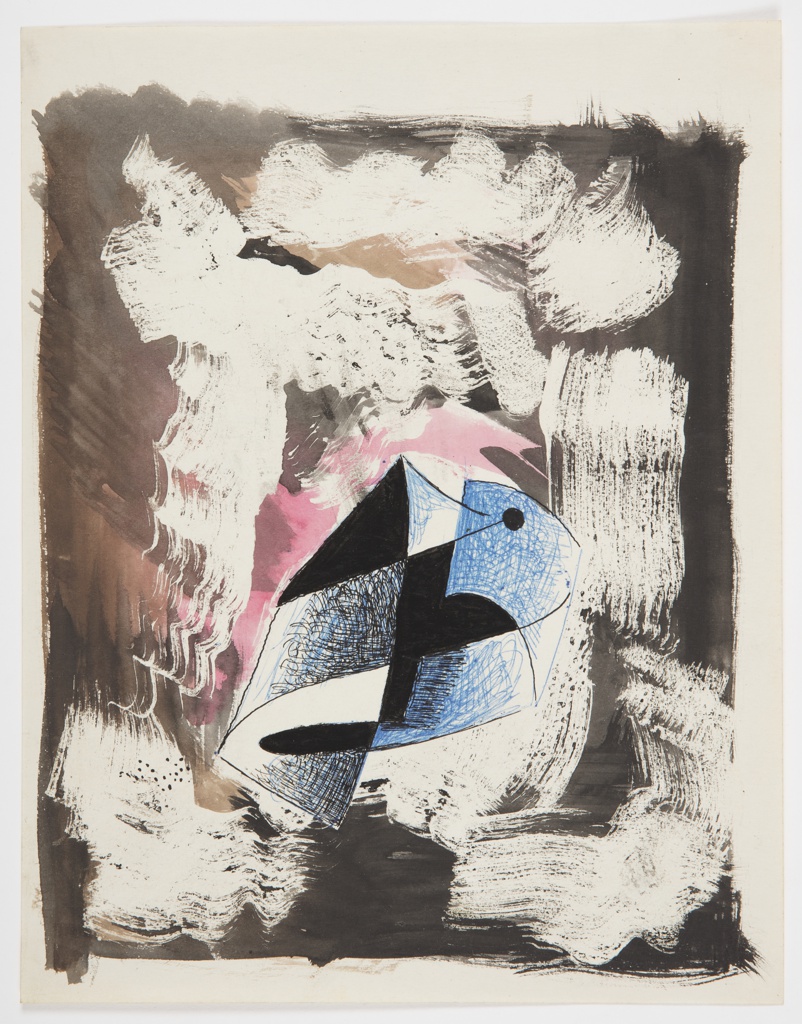 This is a Drawing. It was designed by Edward McKnight Kauffer. It is dated 1935–1939 and we acquired it in 1963. Its medium is pen and black and blue ink, brush and gouache on paper. It is a part of the Drawings, Prints, and Graphic Design department.