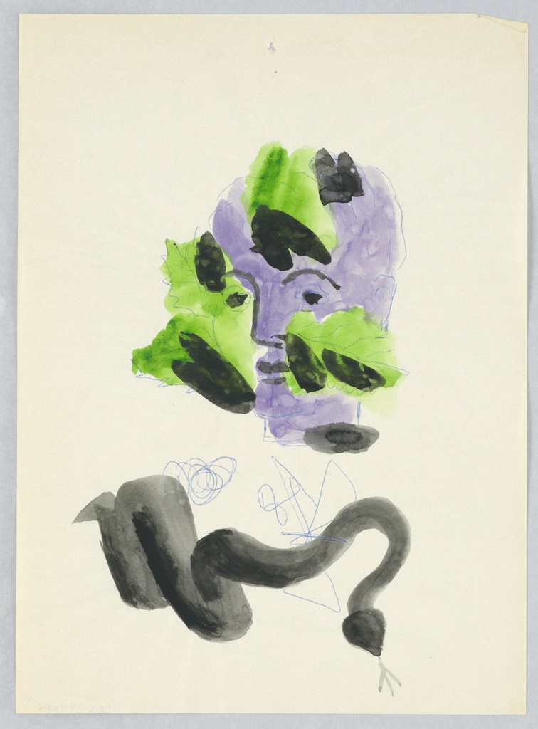 Drawing, Study for an illustration, possibly for "Green Mansions"; Designed by Edward McKnight Kauffer (American, active England, 1890–1954); USA; blue colored pencil, brush and watercolor on paper; Gift of Mrs. E. McKnight Kauffer; 1963-39-1064