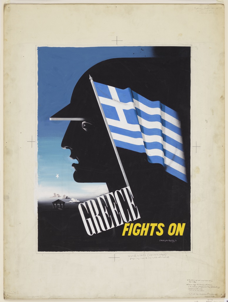 At lower left margin, in ink: [bullet point] If yellow is not [underlined] used—print "FIGHTS ON" in blue [underlined twice] of flag [underlined]. / [bullet point] Please watch [underlined twice] the delicacy of the shading in the features of the face, and the flag, especially the eye [underlined] / "GREECE" in solid white. / "FIGHTS ON" in solid yellow. / [long, horizontal line separating blocks of text] / Print full size = pencil line is boundary edge. / EMcknight Kauffer Under bottom right corner of image, in graphite: Work 23 x 31 (square edges) / page size 24 x 32 (1/2 " white all around) At upper right margin, in graphite: Full size poster: 24 x 32? / yellow [illegible] / 2 Bl[illegible] – Black
