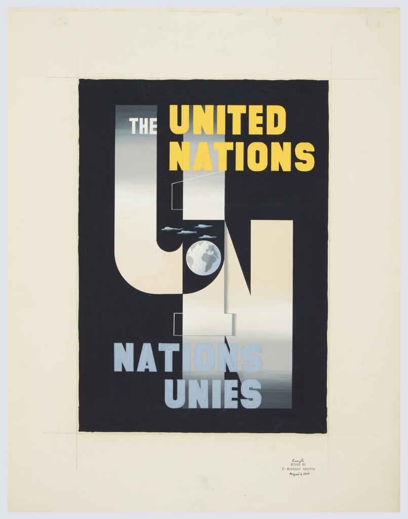 This is a Drawing. It was designed by E. McKnight Kauffer and made for (as the client) United Nations. It is dated August 6, 1946 and we acquired it in 1963. Its medium is brush and gouache. It is a part of the Drawings, Prints, and Graphic Design department.