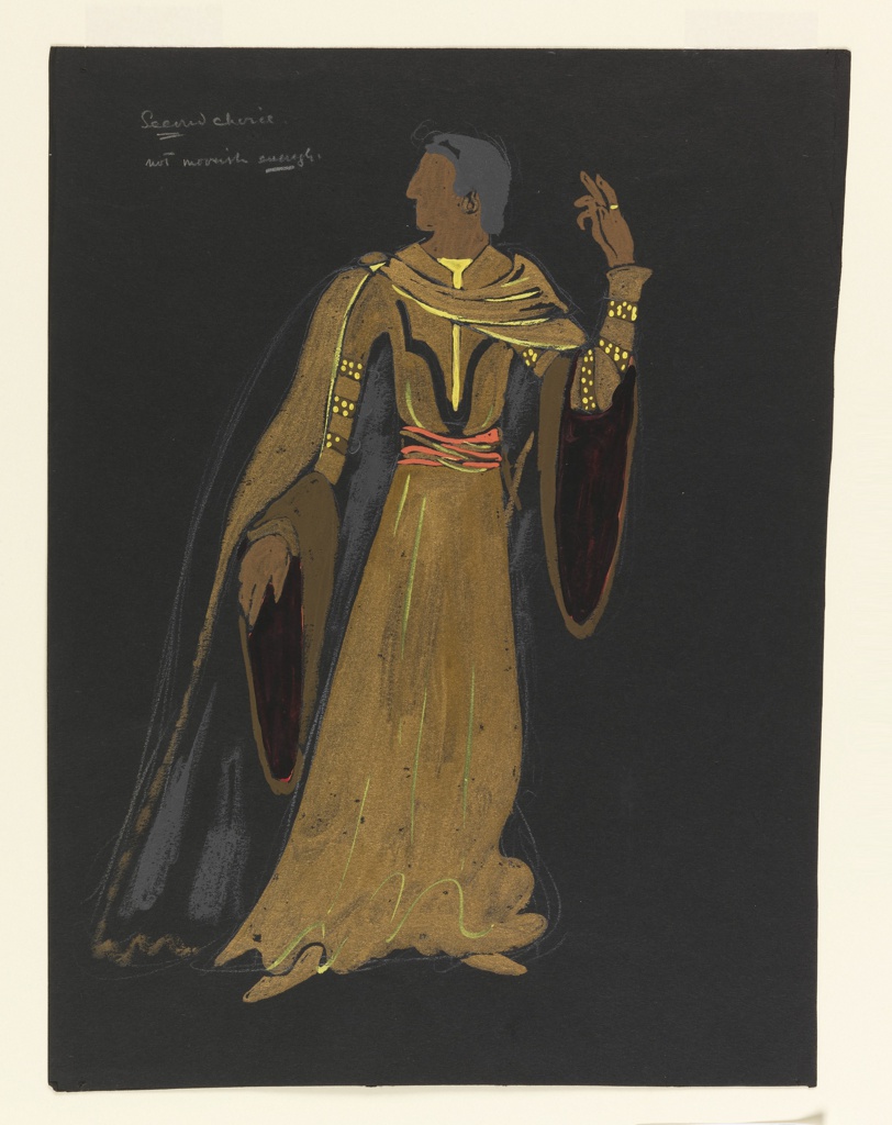Drawing, Costume Design: Othello, for "Othello"; Designed by Edward McKnight Kauffer (American, active England, 1890–1954); Written by William Shakespeare (British, ca. 1564–1616); Produced by Ernest Milton (British, b. America, 1890–1974); USA; brush and gouache, graphite, and white crayon on black paper; 37 × 28.7 cm (14 9/16 × 11 5/16 in.), irregular; Gift of Mrs. E. McKnight Kauffer; 1963-39-198