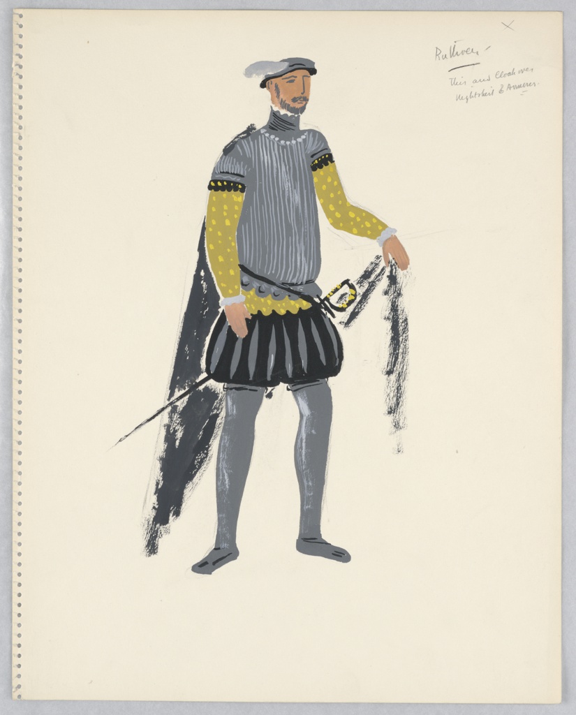 Drawing, Costume Design: Ruthven, for "Queen of Scots"; Designed by Edward McKnight Kauffer (American, active England, 1890–1954); Production directed by Sir John Gielgud; USA; brush and gouache, graphite on notebook paper; 34 × 26.9 cm (13 3/8 × 10 9/16 in.); Gift of Mrs. E. McKnight Kauffer; 1963-39-249