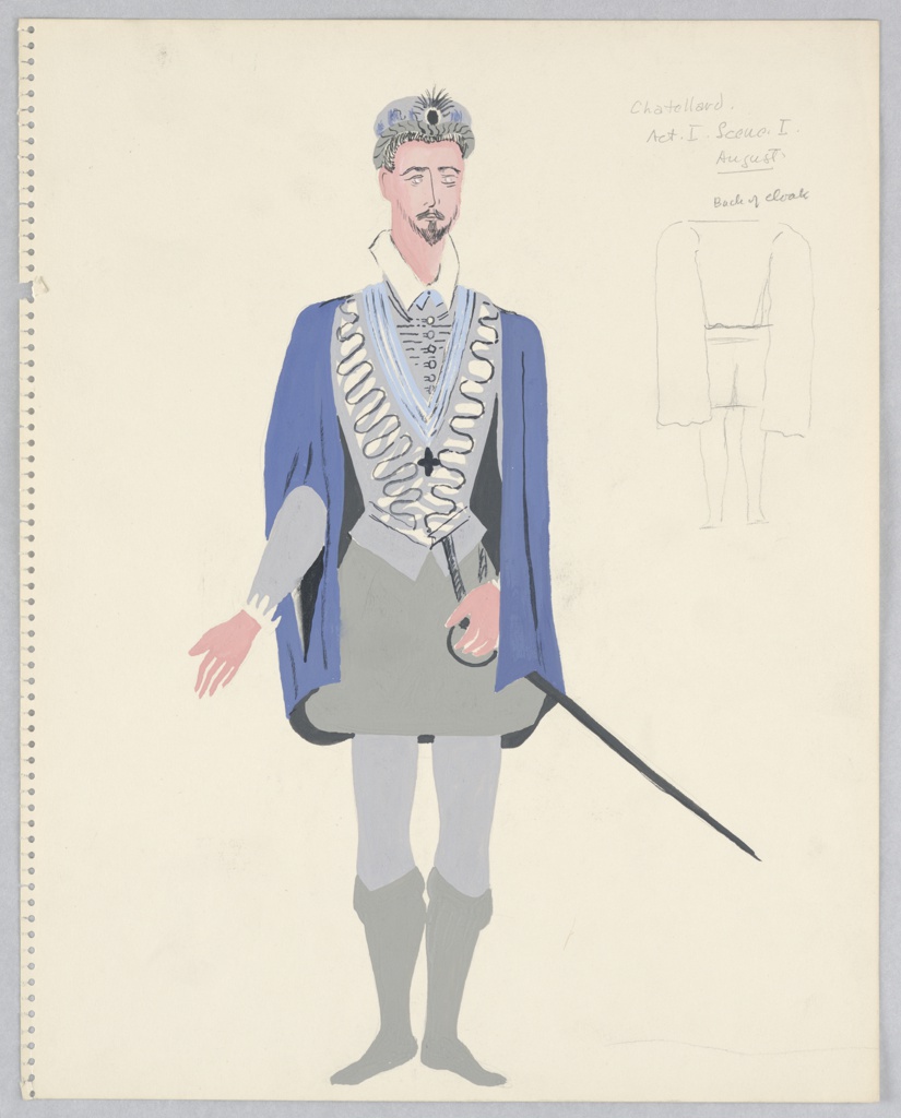 Inscribed in graphite, upper right: Chatellard. / Act. I. Scene. I. / August. / Back of cloak [sketch of design seen from behind]